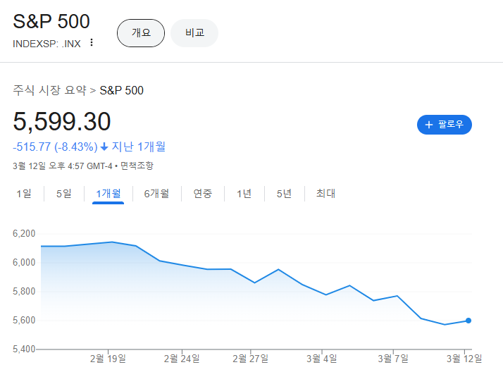 지난주(2025년 3월 6일~12일), 미국 대형주 500개 기업의 모음인 S&P 500이 3-4%가량 하락했다. 1달간으로 계산해 보면 -8.43%이다. 도대체 왜 이런 현상이 벌어지고 있는지, 3가지 주요 이슈를 정리해 보았다.