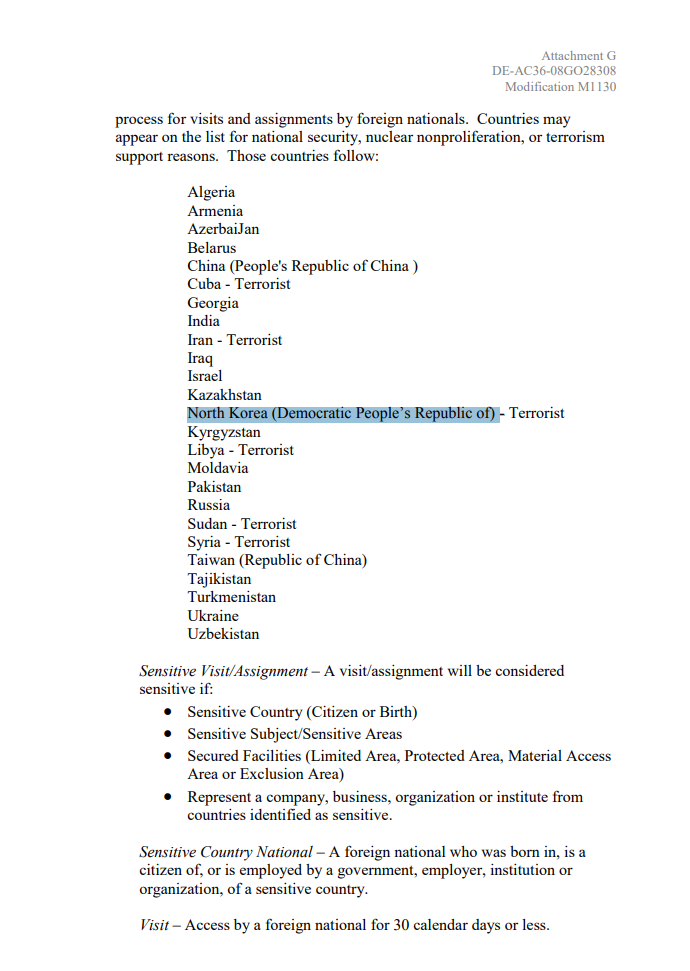 미국 에너지부(DOE)가 관리하는 ‘민감국가 및 기타 지정국가 목록’(Sensitive and Other Designated Countries List, SCL)은 국가안보, 핵 비확산, 지역 불안정, 경제안보 위협, 테러 지원 등 정책적 이유로 특별 관리가 필요한 국가들을 지정한 명단입니다.