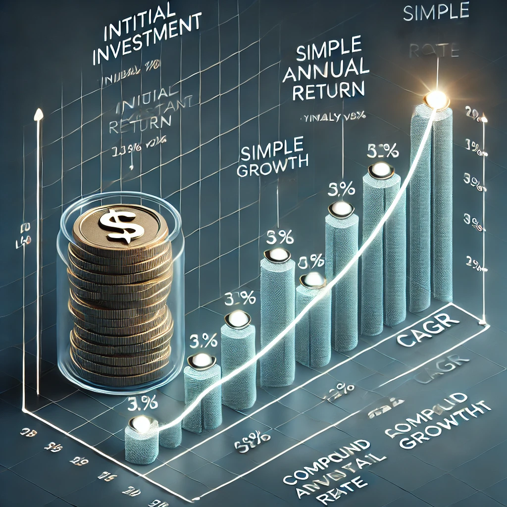 예를 들어 5년 동안 어떤 자산에 투자해서 원금이 두 배가 되었다면, 그 자산의 5년간 CAGR은 “매년 약 몇 % 씩 불어난 셈인가”를 알려주는 수치입니다. CAGR은 복리 효과를 감안한 성장률로, 기간 동안의 변동성을 모두 고려해 평균을 낸 것이라 볼 수 있습니다.